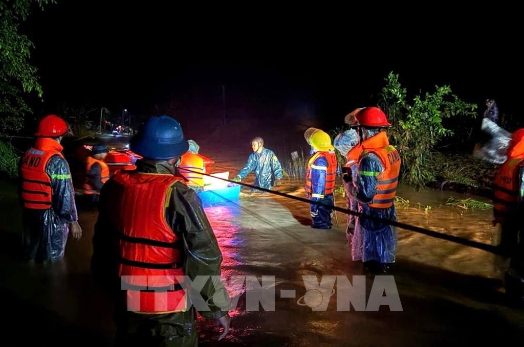 Lực lượng chức năng xã Yang Mao di dời các hộ dân vùng ngập lụt đên nơi an toàn trong đêm. Ảnh: TTXVN phát