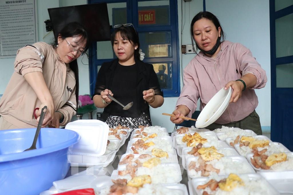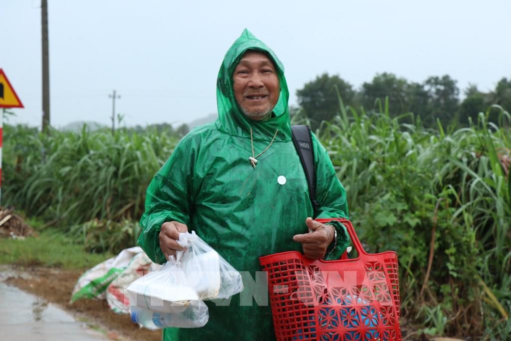 Người dân xã Sơn Thành nhận những suất cơm sau nhiều ngày "vật lộn" với mưa lũ. Ảnh: Tuấn Anh - TTXVN