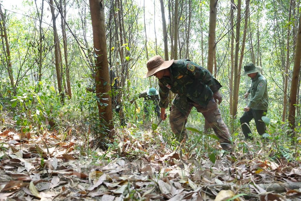 Người dân và chủ rừng phối hợp xử lý cục bộ vật liệu cháy trên diện tích rừng trồng ở xã Cư Pui, tỉnh Đắk Lắk. Ảnh: Tuấn Anh – TTXVN