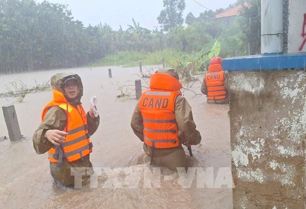 Lực lượng Công an hỗ trợ di dời người dân vùng ngập sâu đến nơi an toàn. Ảnh: TTXVN phát