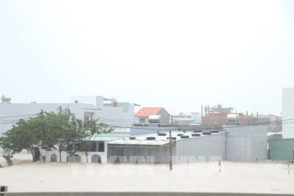 Những ngôi nhà cao tầng ở phường Tuy Hòa cũng bị ngập sâu. Ảnh: Tuấn Anh - TTXVN