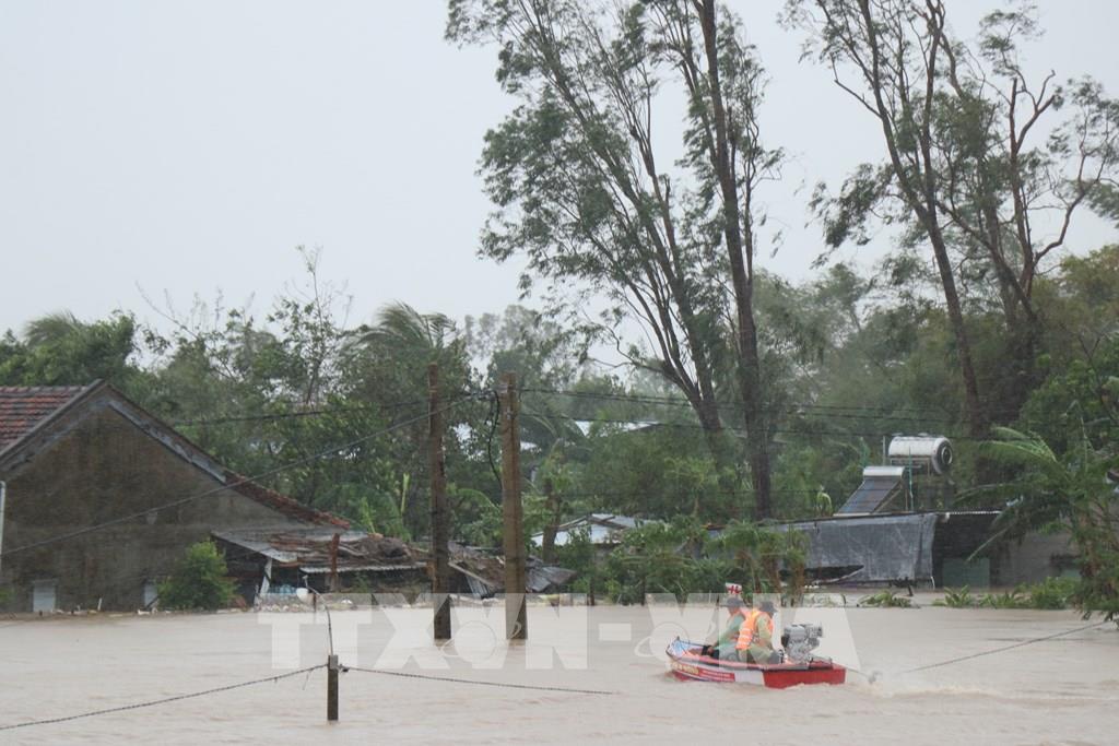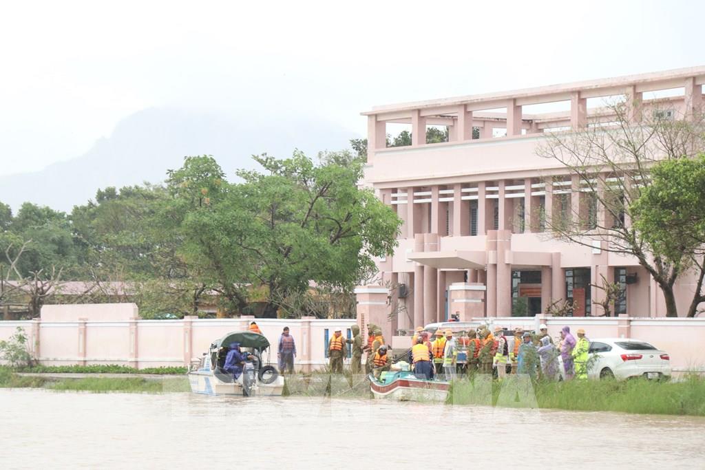 Lực lượng chức năng nỗ lực tiếp cận những khu vực ngập sâu. Ảnh: Tuấn Anh - TTXVN