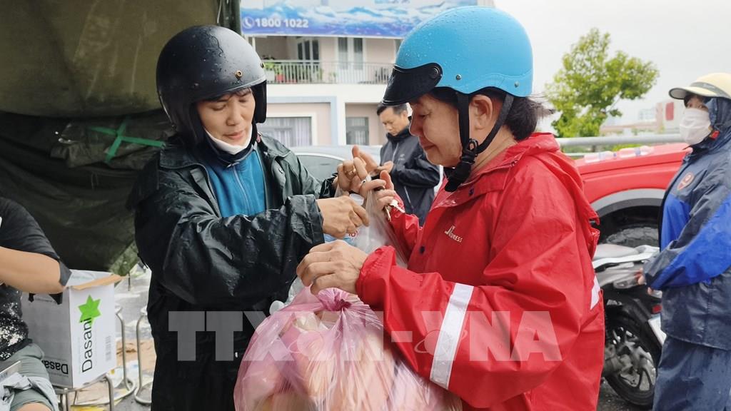 Hỗ trợ thức ăn, nước uống cho người dân Khánh Hòa bị ảnh hưởng mưa lũ. Ảnh: Nguyễn Thành – TTXVN