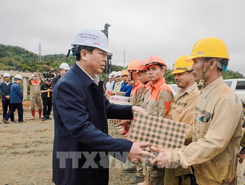 Bộ trưởng Bộ Xây dựng Trần Hồng Minh tặng quà động viên công nhân đang thi công các dự án cao tốc. Ảnh: Diệp Anh - TTXVN
