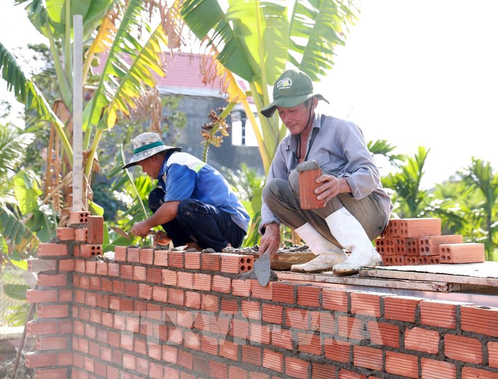Cán bộ công an xã Diên Điền (tỉnh Khánh Hòa) hỗ trợ xây dựng nhà mới cho hộ gia đình Nguyễn Thị Mỹ Châu (xã Diên Điền, tỉnh Khánh Hòa). Ảnh: Xuân Triệu - TTXVN