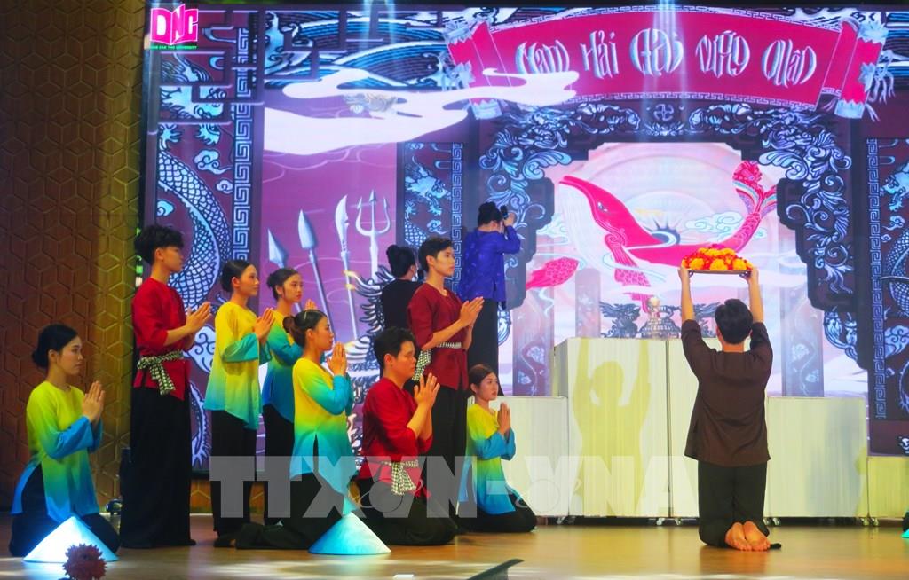 Tiết mục “Lý kéo chài”, tái hiện cảnh đoàn thuyền ra khơi và sự gắn bó mật thiết giữa con người với biển cả. Ảnh: Ánh Tuyết - TTXVN