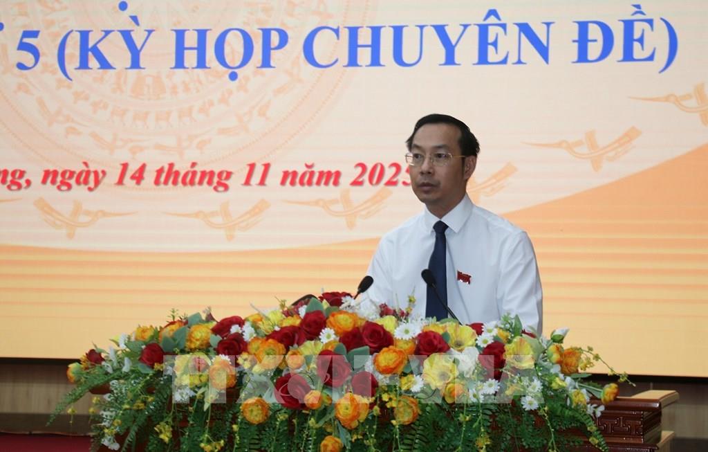 Ông Nguyễn Thanh Nhàn, Chủ tịch HĐND tỉnh An Giang, phát biểu tại kỳ họp. Ảnh: Lê Huy Hải - TTXVN