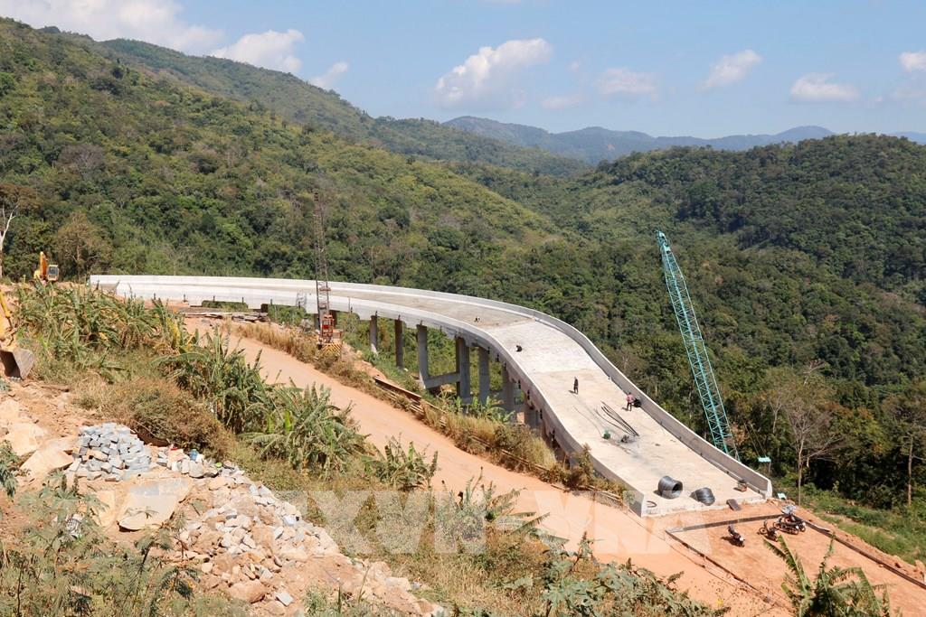 Thi công cầu cạn mở rộng cua an toàn trên đèo Đại Ninh thuộc quốc lộ 28B. Ảnh: Nguyễn Thanh - TTXVN