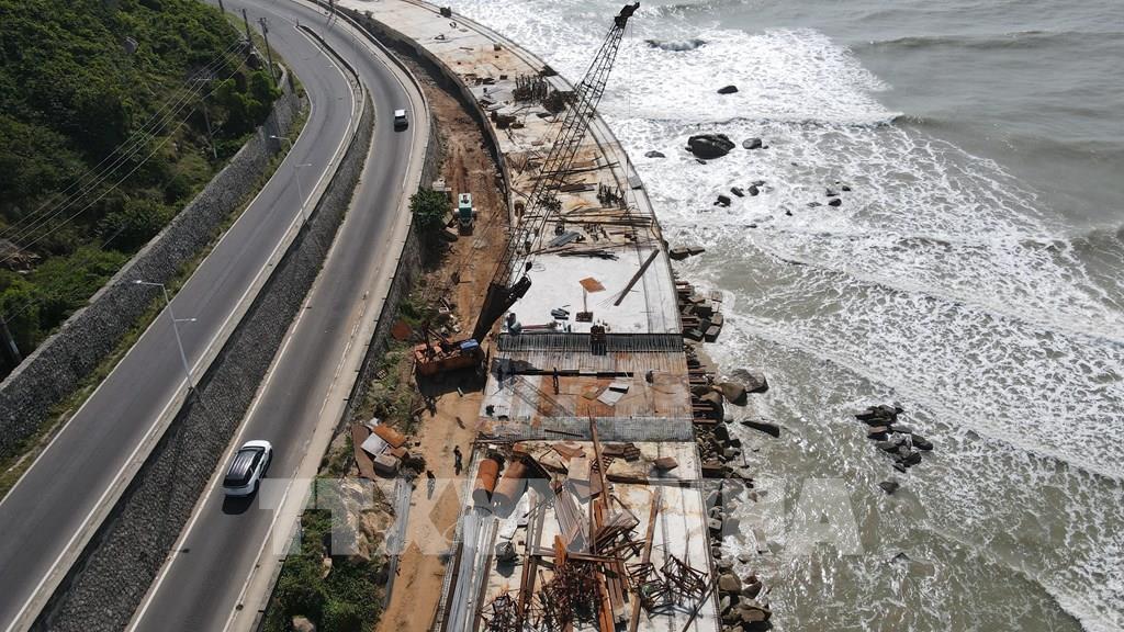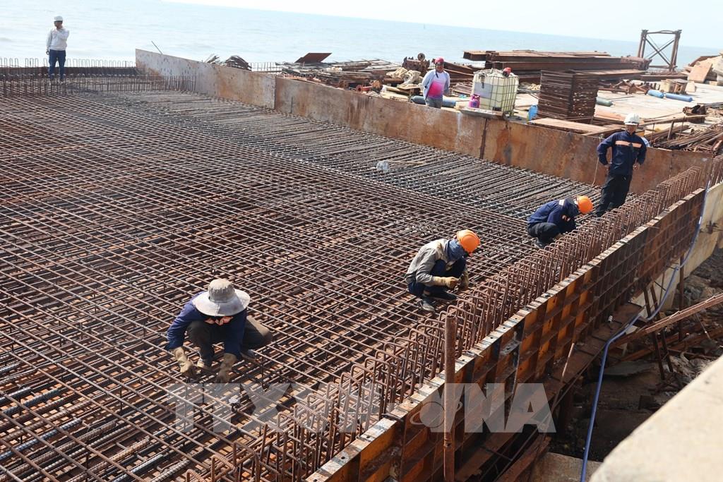 Công nhân thi công tại hạng mục cầu cạn qua mũi Kỳ Vân (Đèo nước ngọt). Ảnh: Hoàng Nhị - TTXVN