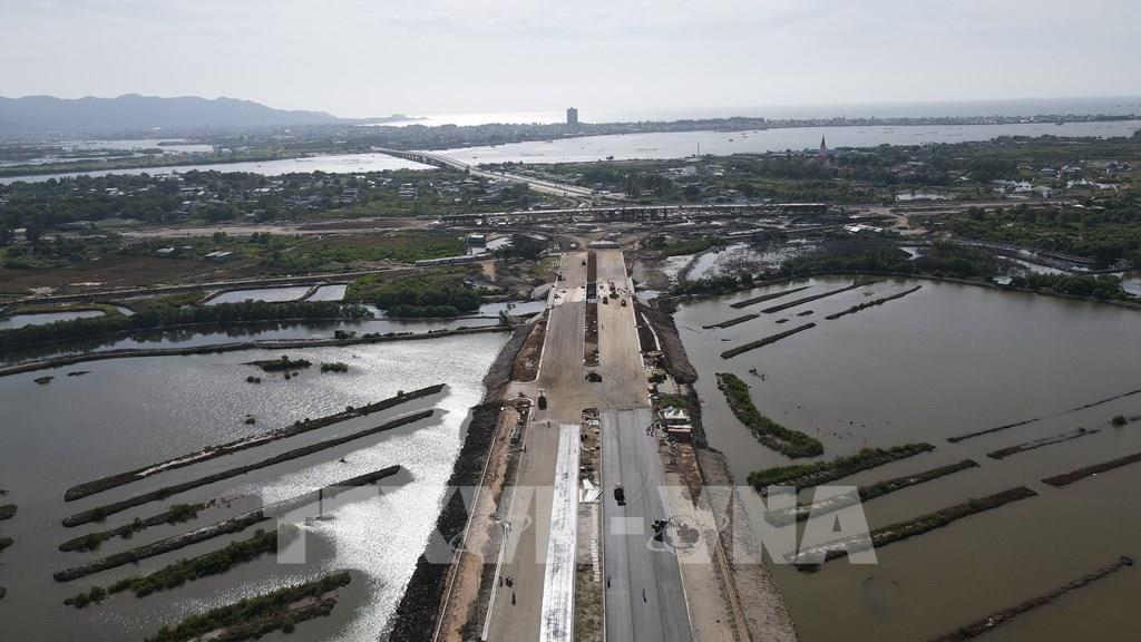 Hạng mục cầu cạn qua mũi Kỳ Vân (Đèo nước ngọt) đang được nhà thầu thi công nỗ lực hoàn thành trong tháng 1/2026. Ảnh: Hoàng Nhị - TTXVN