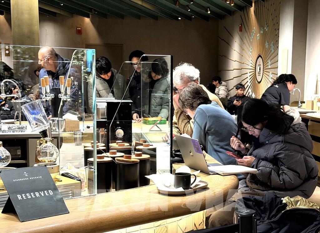 Khách hàng thưởng thức cà phê bên trong cửa hàng Starbucks lớn nhất thế giới tại thành phố Chicago của Mỹ. Ảnh: Ngọc Quang, PV TTXVN tại Mỹ