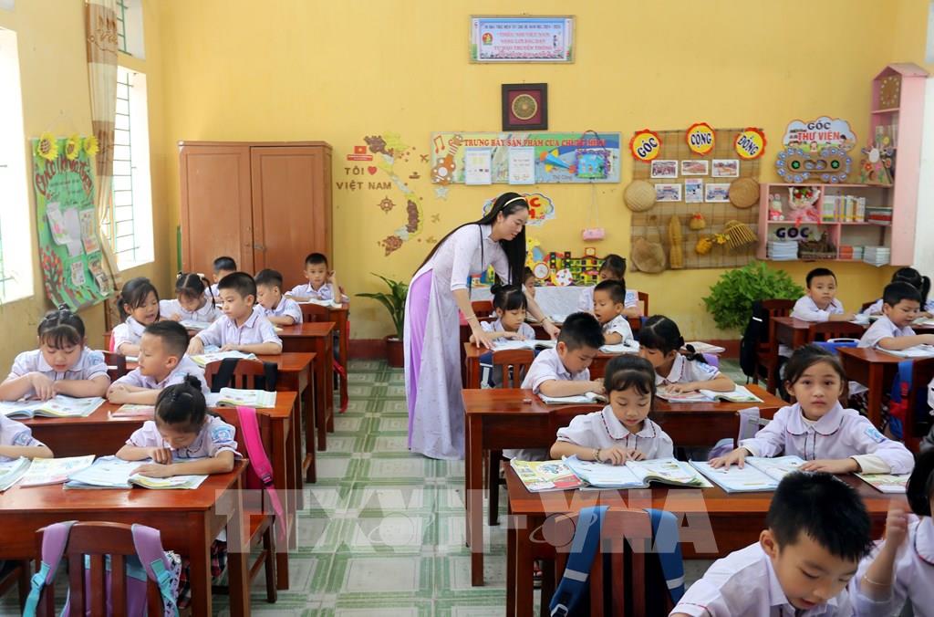 Giáo viên trường Tiểu học Kim Thái (tỉnh Nam Định cũ) hướng dẫn học sinh học bài. Ảnh tư liệu: Nguyễn Lành - TTXVN