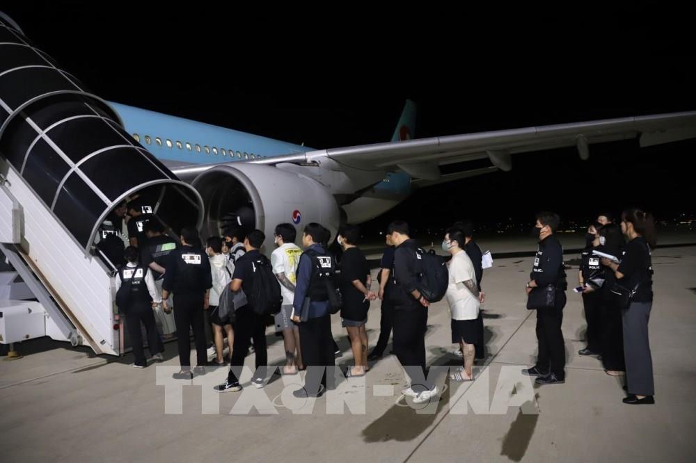 Các công dân Hàn Quốc liên quan hoạt động lừa đảo sử dụng công nghệ được bàn giao tại sân bay quốc tế ở thủ đô Phnom Penh, Vương quốc Campuchia, tối 17/10/2025. Ảnh: AKP/TTXVN phát