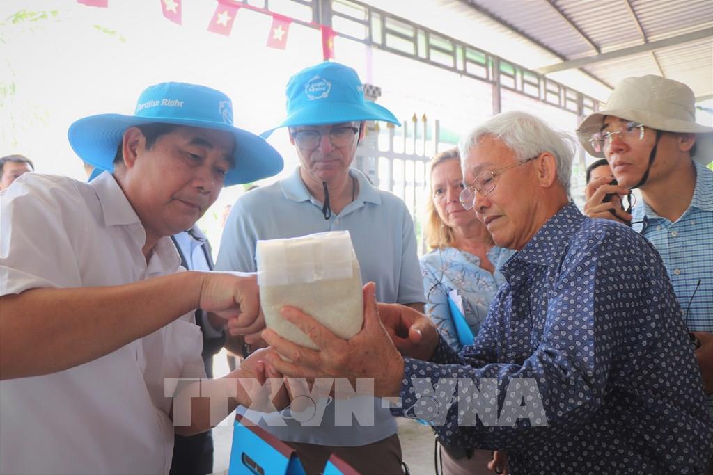 Ông Phạm Thái Bình, Tổng Giám đốc Công ty Cổ phần Nông nghiệp công nghệ cao Trung An (phải) chia sẻ về gạo hữu cơ, giảm phát thải. Ảnh: Thu Hiền - TTXVN