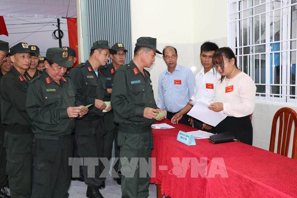 Các chiến sĩ Tiểu đoàn Cảnh sát Cơ động số 2 (Trung đoàn Cảnh sát Cơ động Tây Nam bộ, Bộ Tư lệnh Cảnh sát Cơ động) đi bầu tại khu vực bỏ phiếu ấp Hương Phụ A, xã Châu Thành, tỉnh Vĩnh Long. Ảnh: Thanh Hòa- TTXVN
