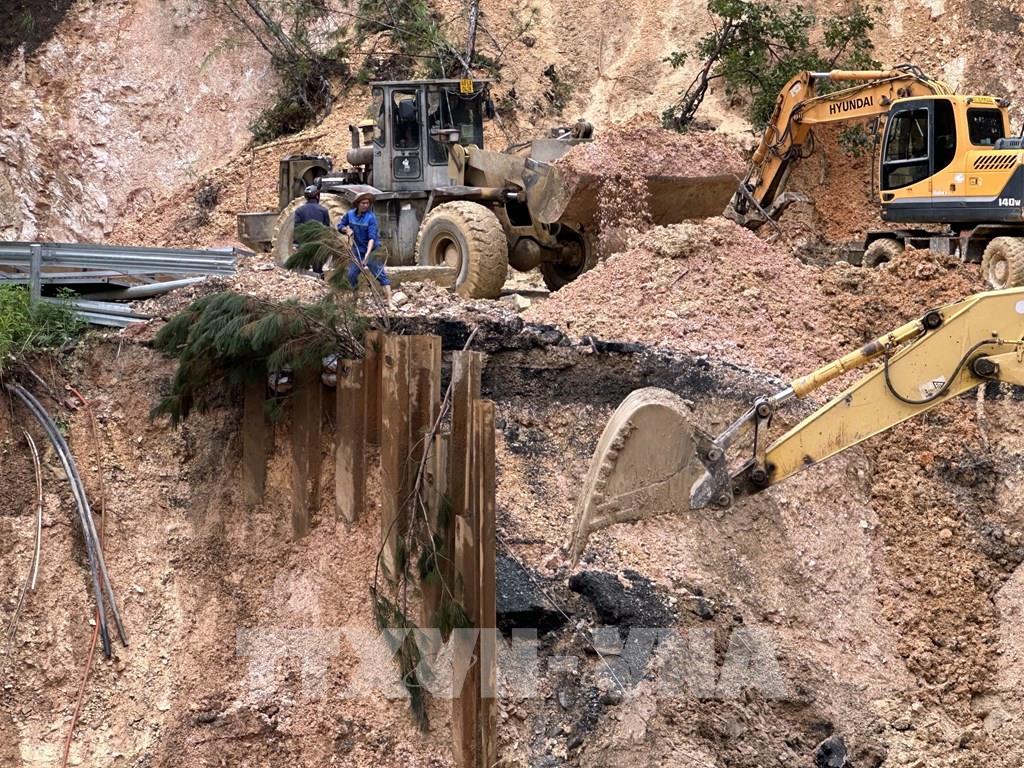 Các phương tiện của Công ty TNHH Hưng Nguyên nỗ lực xử lý khu vực sạt lở nhằm thông đèo Mimosa vào chiều 4/12. Ảnh: Chu Quốc Hùng- TTXVN