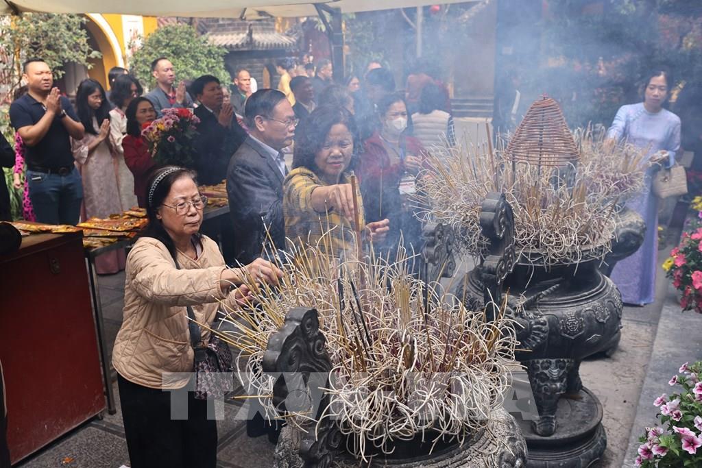 Người dân Hà Nội đi lễ đầu năm tại chùa Trấn Quốc sáng mùng 1 Tết Bính Ngọ. Ảnh: Minh Đức - TTXVN