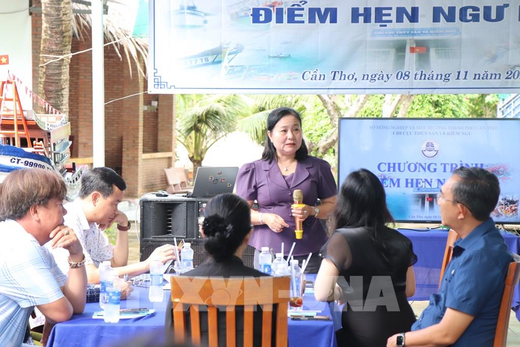 Bà Quách Thị Thanh Bình, Phó Giám đốc Sở Nông nghiệp và Môi trường Cần Thơ giải đáp những thắc mắc của tàu cá về thay đổi thiết bị giám sát hành trình. Ảnh: Thu Hiền - TTXVN