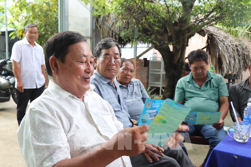 Các chủ tàu đọc thông tin quy định tránh khai thác thủy sản bất hợp pháp, không theo quy định. Ảnh: Thu Hiền - TTXVN
