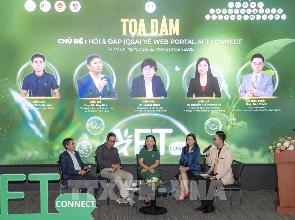 Đại biểu chia sẻ thông tin về thực phẩm, nông sản minh bạch tại lễ ra mắt AFT Connect. Ảnh: Xuân Anh - TTXVN