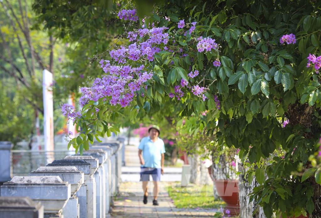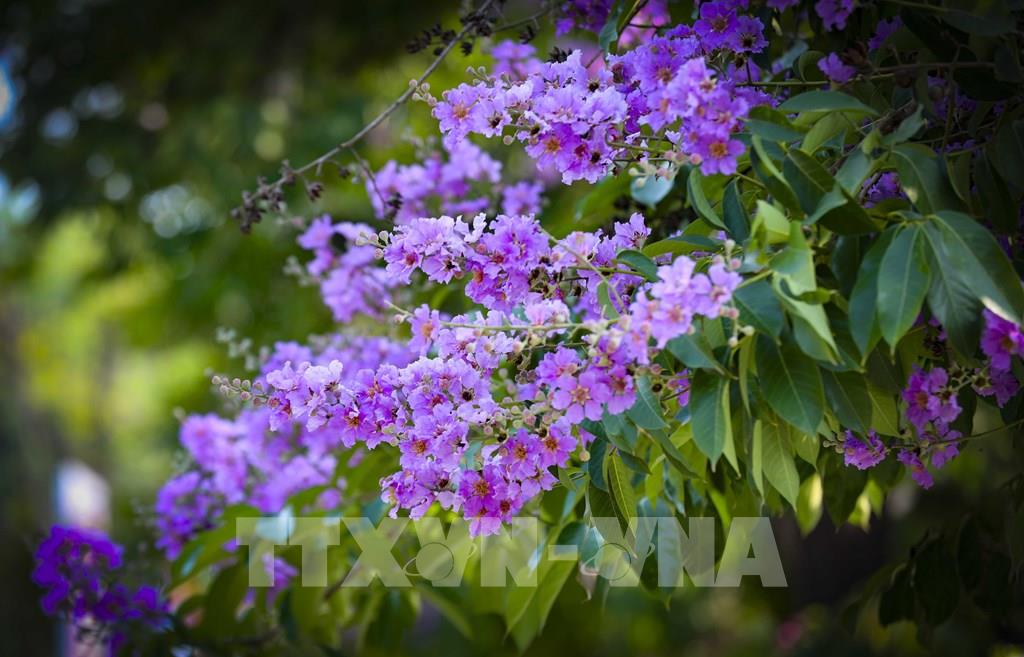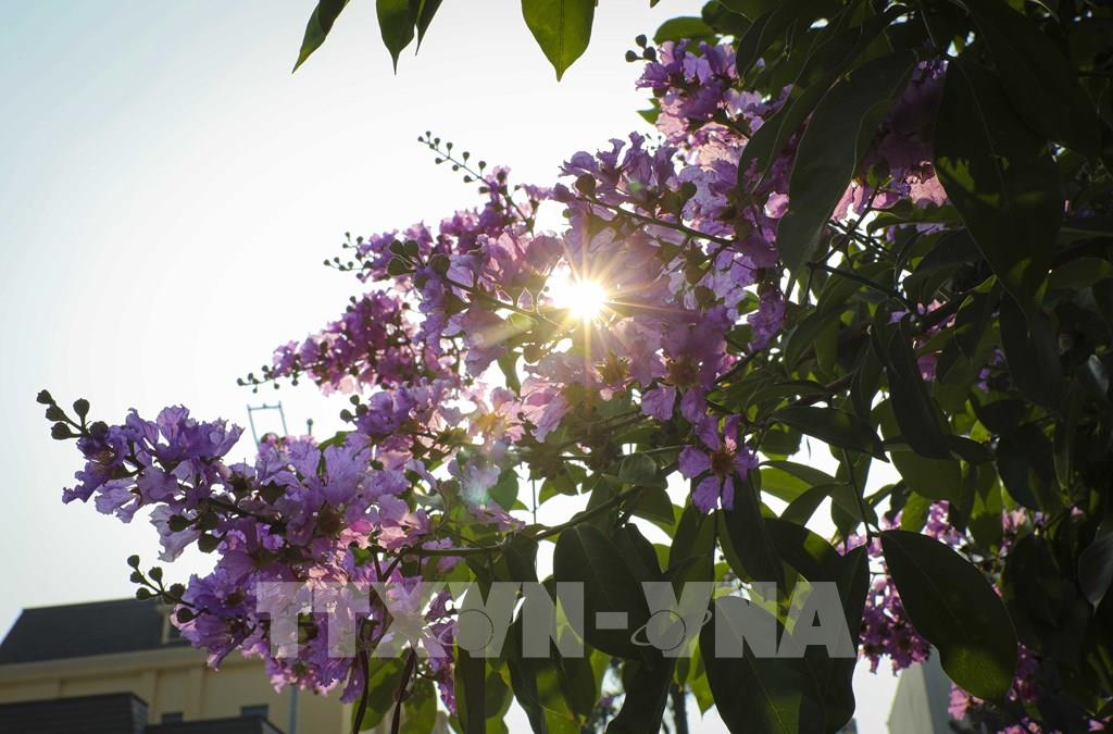 Những hàng bằng lăng đồng loạt bung nở, tạo điểm nhấn nổi bật trên các trục đường đô thị. Ảnh: Xuân Tư - TTXVN