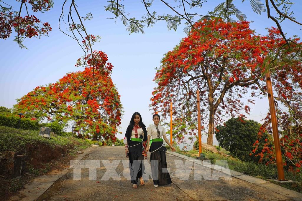 Những thiếu nữ dân tộc Thái khoe sắc bên hàng phượng vĩ đỏ rực trên Đồi A1. Ảnh: Xuân Tư - TTXVN