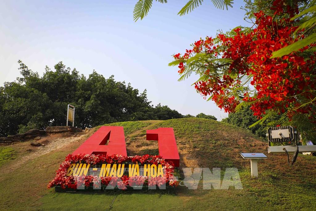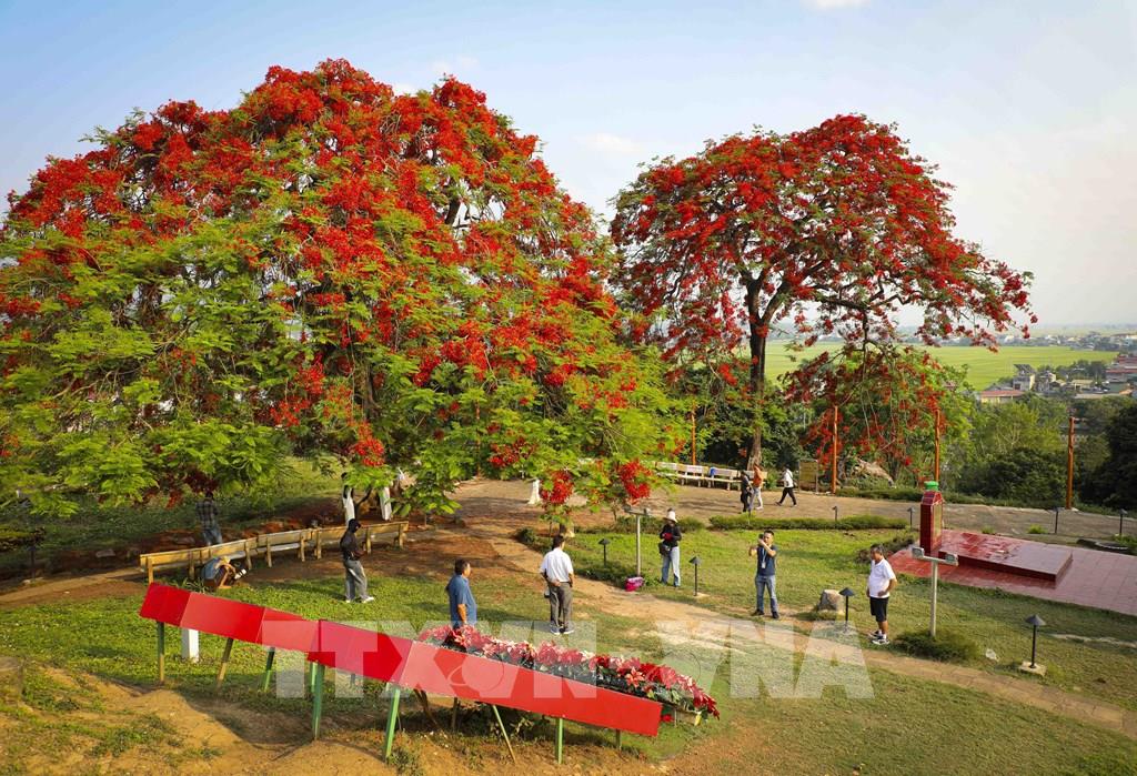 Tại điểm di tích lịch sử Đồi A1, sắc đỏ của hoa phượng như gợi nhắc về những năm tháng chiến đấu oanh liệt. Ảnh: Xuân Tư - TTXVN