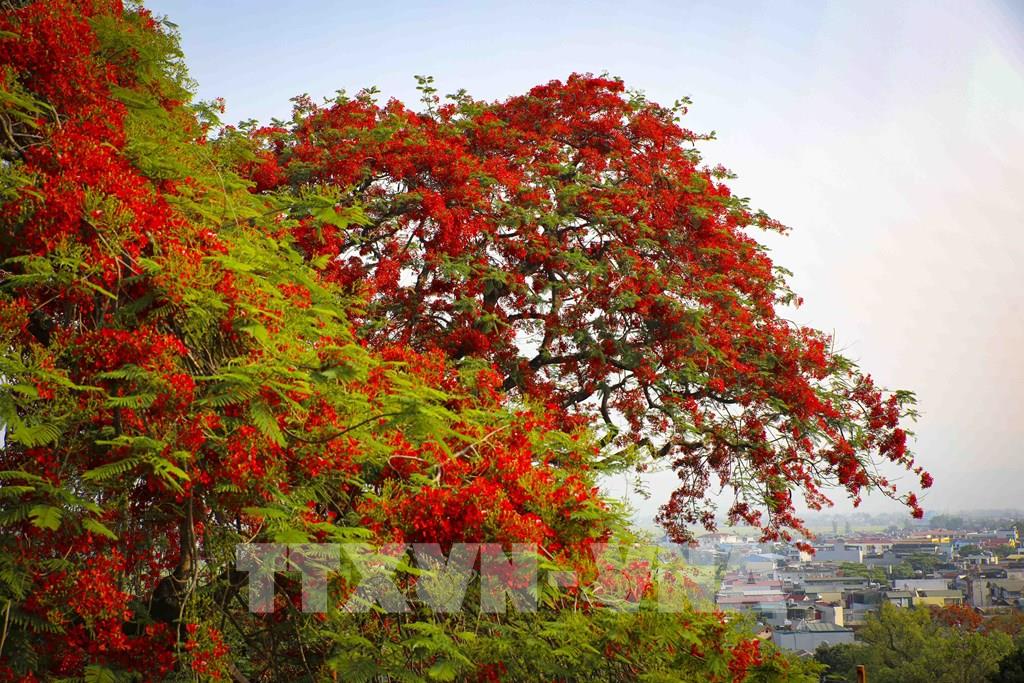 Những cây hoa phượng cổ thụ bung nở rực rỡ trên Đồi A1. Ảnh: Xuân Tư - TTXVN