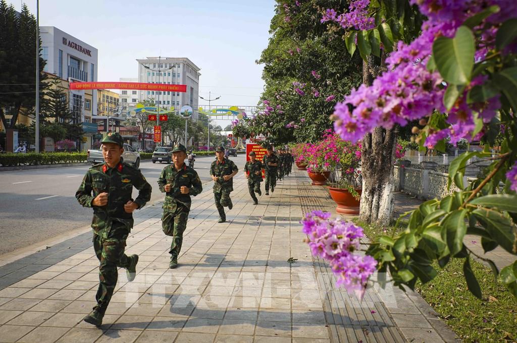 Chiến sĩ luyện tập trên tuyến phố rợp sắc hoa bằng lăng. Ảnh: Xuân Tư - TTXVN