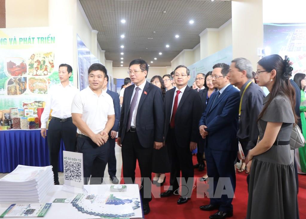 Các đại biểu tham quan triển lãm sản phẩm công nghệ, kết nối doanh nghiệp. Ảnh: Thanh Thương- TTXVN