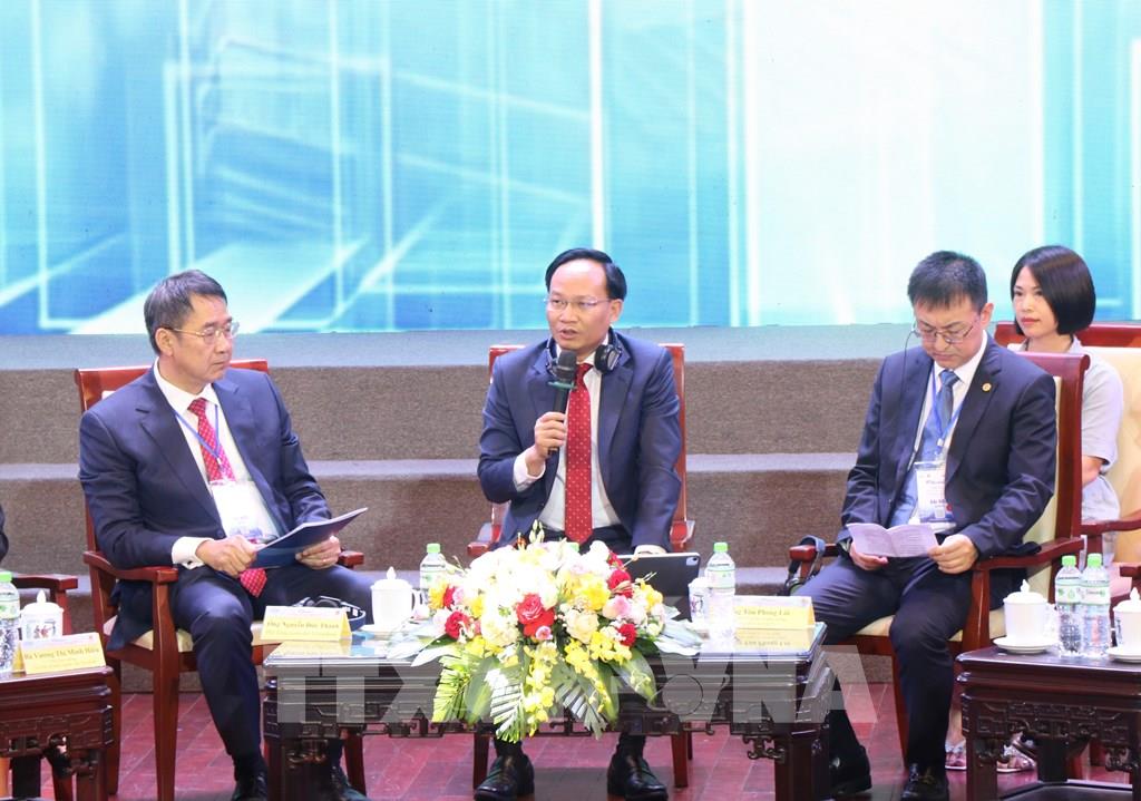 Phó Chủ tịch UBND tỉnh Bắc Ninh Phạm Văn Thịnh (ở giữa) trao đổi tại Diễn đàn “Tái định vị chuỗi cung ứng; bứt phá năng lực nội sinh để thu hút dòng vốn mới”. Ảnh: Thanh Thương- TTXVN