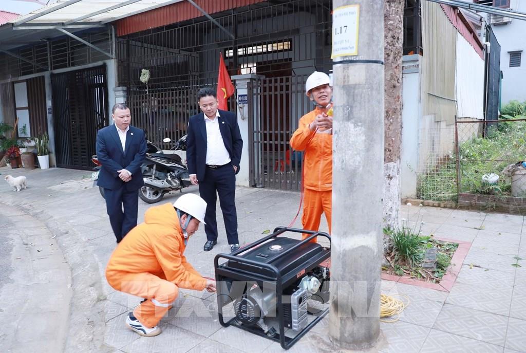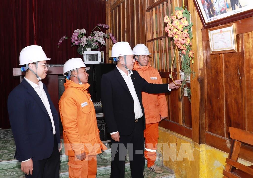 Lãnh đạo Công ty Điện lực Lai Châu cùng cán bộ kỹ thuật kiểm tra hệ thống lưới điện, trang thiết bị cấp điện tại điểm bầu cử bản Lao Chải 1, xã Khun Há. Ảnh: Quý Trung – TTXVN