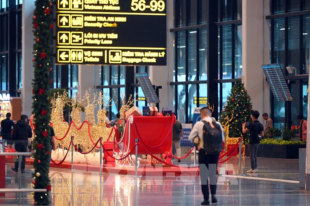 Tại các cổng vào Nhà ga, dây thông xanh, ngôi sao Noel, đàn hươu rực sáng và chiếc nơ đỏ khổng lồ tạo cảm giác chào đón ấm áp. Ảnh: TTXVN phát