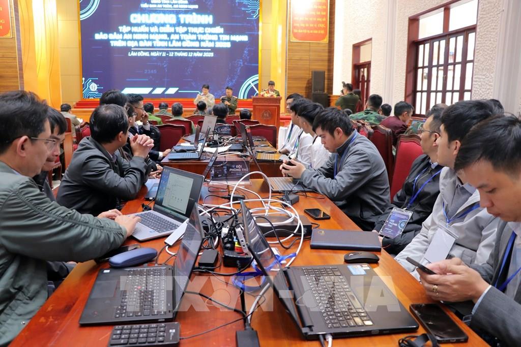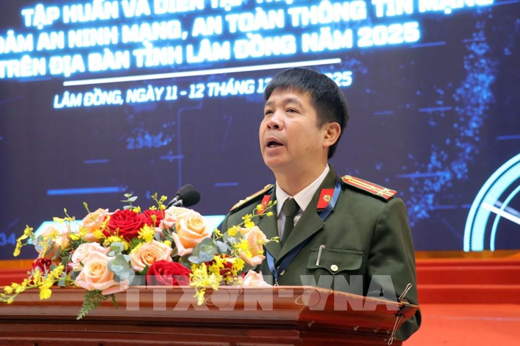 Thượng tá Vũ Hoàng Anh, Trưởng phòng An ninh mạng và phòng, chống tội phạm sử dụng công nghệ cao (Công an tỉnh Lâm Đồng), điều hành cuộc diễn tập. Ảnh: Chu Quốc Hùng - TTXVN