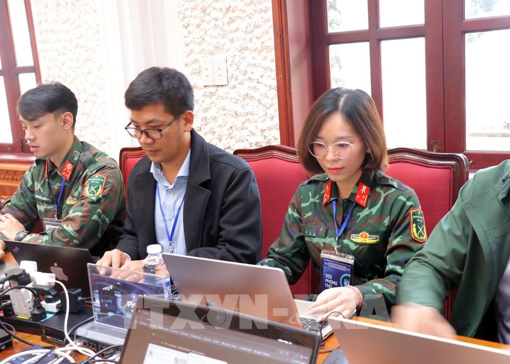 Các thành viên Đội ứng cứu sự cố an toàn thông tin mạng của tỉnh tập trung nội dung cuộc diễn tập. Ảnh: Chu Quốc Hùng - TTXVN