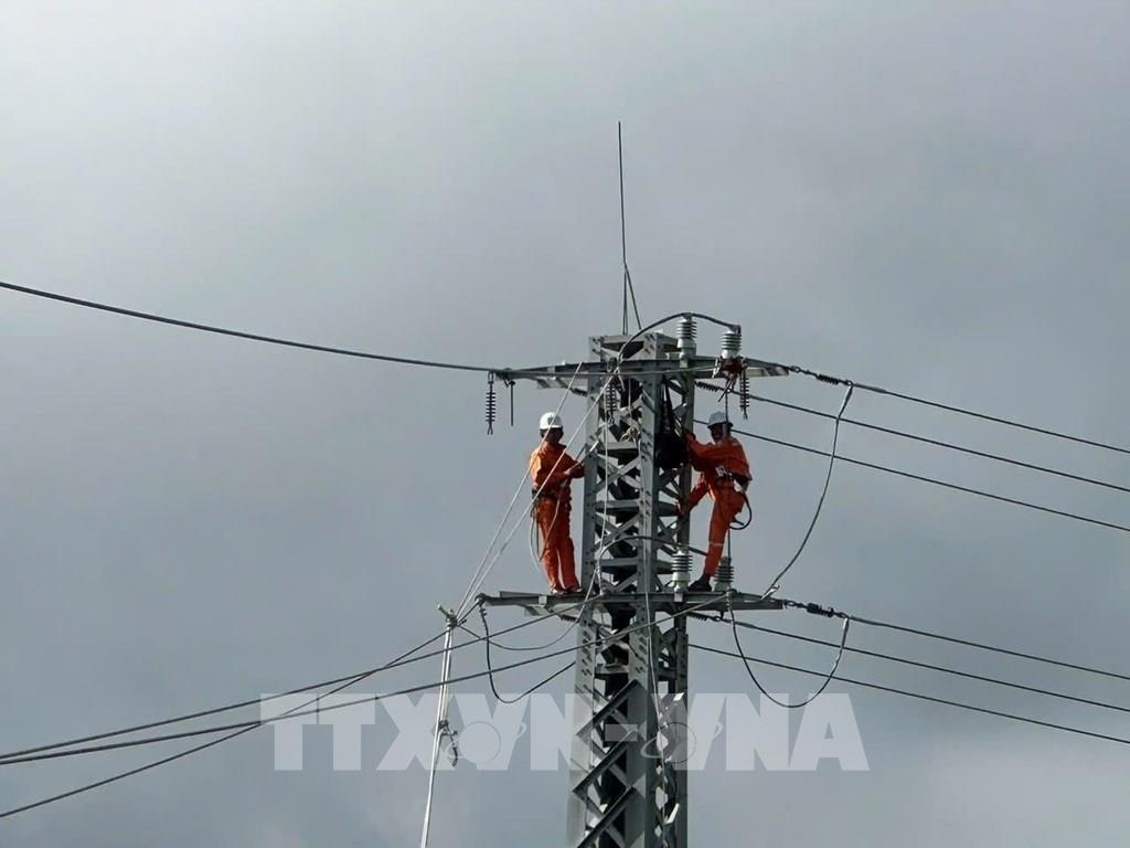 Công nhân điện lực đang nỗ lực khôi phục hệ thống điện bị hư hại do bão số 13 gây ra tại miền Trung. Ảnh: TTXVN phát