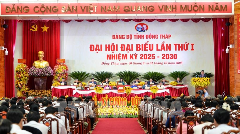 Sáng 1/10, tại Trung tâm Hội nghị tỉnh, Đảng bộ tỉnh Đồng Tháp tổ chức khai mạc Đại hội đại biểu lần thứ I, nhiệm kỳ 2025-2030, với chủ đề “Xây dựng Đảng bộ và hệ thống chính trị trong sạch, vững mạnh; đẩy mạnh đổi mới sáng tạo, phát triển nhanh công nghiệp; xây dựng nền nông nghiệp sinh thái, hiện đại; nâng cao chất lượng cuộc sống nhân dân; đảm bảo vững chắc quốc phòng, an ninh”.