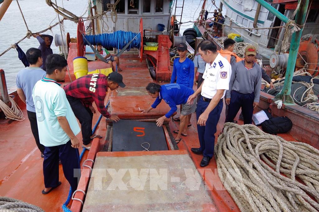 Lực lượng chức năng kiểm tra tàu cá vi phạm. Ảnh: TTXVN phát