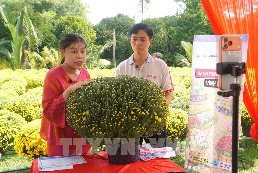 Các nhà sáng tạo nội dung livestream quảng bá sản phẩm cúc mâm xôi cho nhà vườn xã Chợ Lách, tỉnh Vĩnh Long. Ảnh tư liệu: Lê Thúy Hằng – TTXVN