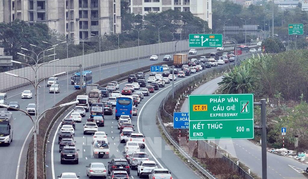 Đoạn kết thúc cao tốc Pháp Vân - Cầu Giẽ hướng về Vành đai 3 xảy ra ùn tắc kéo dài do lượng phương tiện giao thông tăng lên đột biến vào chiều mùng 5 Tết. Ảnh: Phạm Kiên - TTXVN