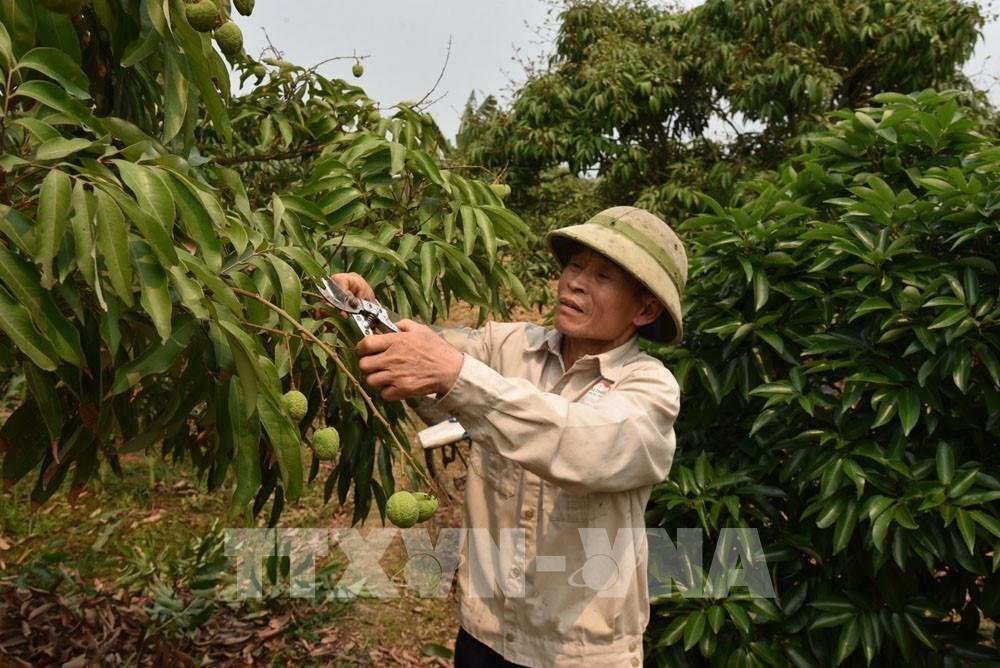Ông Vũ Đức Nhuận ở thôn Thiệu Mỹ, xã Hà Đông, thành phố Hải Phòng chăm sóc vườn vải. Ảnh: Mạnh Minh – TTXVN