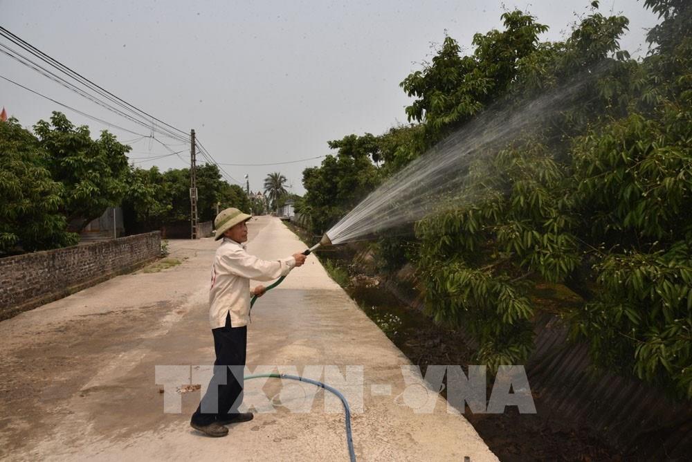 Nông dân tưới dưỡng ẩm cho cây vải. Ảnh: Mạnh Minh – TTXVN