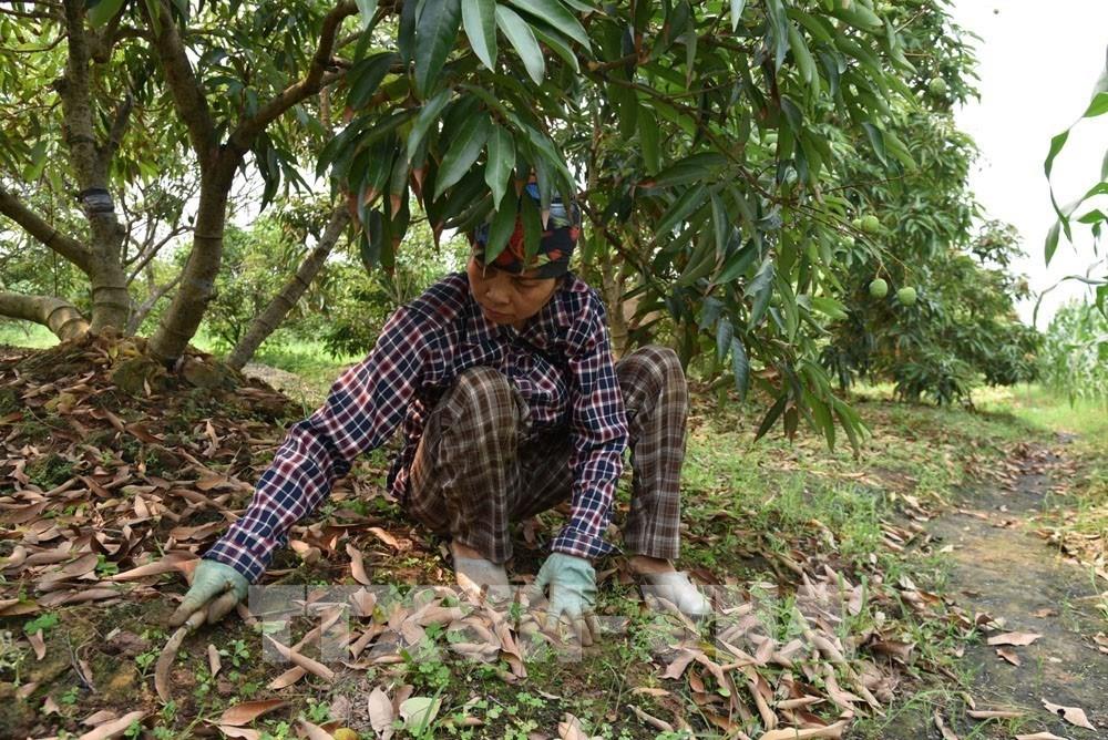 Nông dân dọn cỏ quanh gốc, tỉa bớt lộc để các chất dinh dưỡng trong đất tập trung nuôi quả. Ảnh: Mạnh Minh – TTXVN