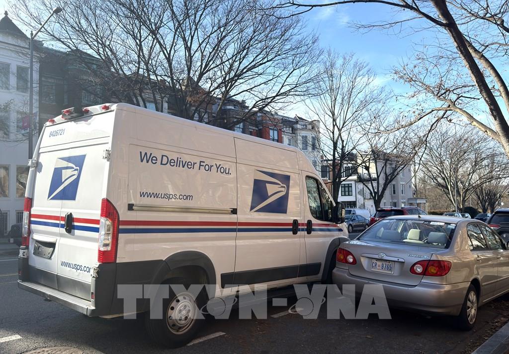Xe vận chuyển bưu kiện, thư tín của Dịch vụ Bưu chính Mỹ (USPS) trên đường phố Washington DC. Ảnh: Ngọc Quang - PV TTXVN tại Mỹ