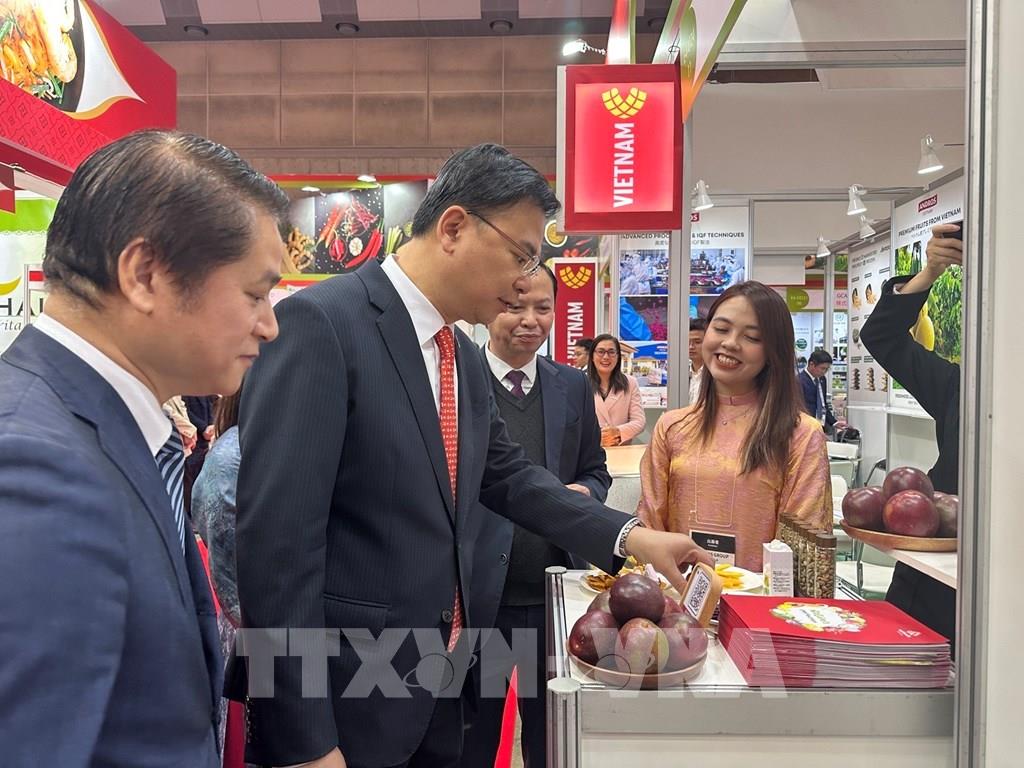Đại sứ Việt Nam tại Nhật Bản Phạm Quang Hiệu tham quan một gian hàng giới thiệu trái cây Việt Nam. Ành: Nguyễn Tuyến - PV TTXVN tại Nhật Bản