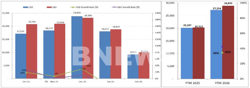 Tính đến hết tháng 2/2026, doanh số bán hàng của xe lắp ráp trong nước tăng 35% trong khi xe nhập khẩu tăng 42% so với cùng kỳ năm ngoái