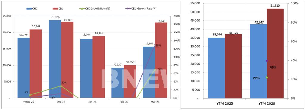 Tính đến hết tháng 3/2026, doanh số bán hàng của xe lắp ráp trong nước tăng 22% trong khi xe nhập khẩu tăng 40% so với cùng kỳ năm ngoái. Nguồn: VAMA