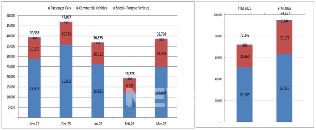 Tổng doanh số bán hàng của toàn thị trường tính đến hết tháng 3/2026 tăng 31% so với cùng kỳ năm trước, trong đó biểu đồ màu xanh là xe lắp ráp trong nước, màu đỏ là xe nhập khẩu nguyên chiếc. Nguồn: VAMA