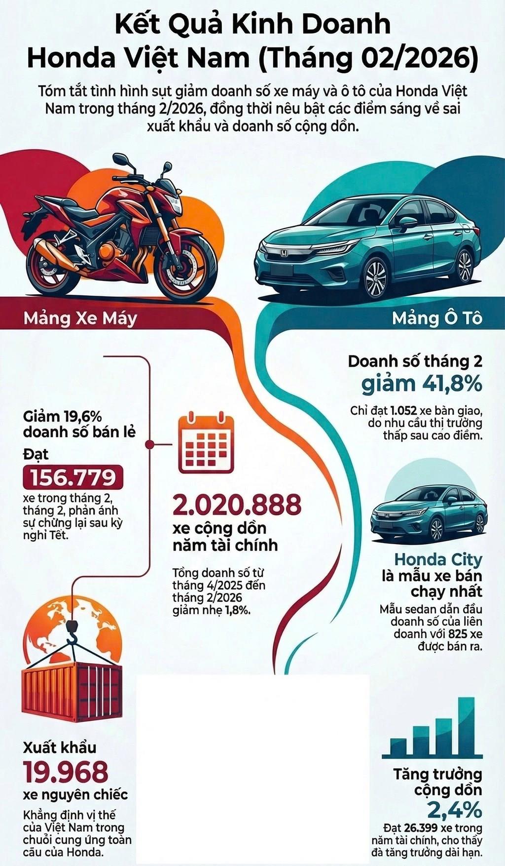 Honda Việt Nam công bố kết quả kinh doanh tháng 2/2026 với doanh số xe máy đạt 156.779 xe và ô tô đạt 1.052 xe, lần lượt giảm ở mức 19,6% và 41,8% so với cùng kỳ năm trước