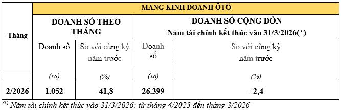 Doanh số ô tô tháng 2/2026 giảm mạnh do yếu tố mùa vụ
